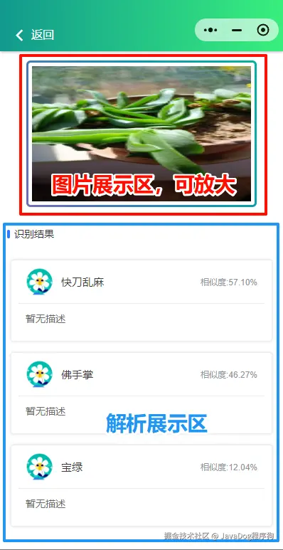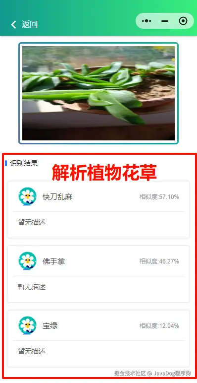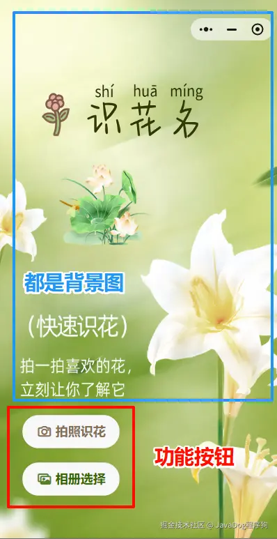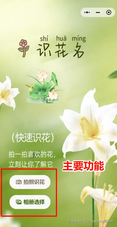 确认好功能,如本小程序为拍照/相册选择识别花草植物,并调用解析接口展示