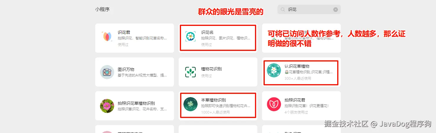 本狗需要开发扫描识别植物花草小程序,就去小程序中搜索相关的关键字,如识花、花识别、植物识别等,找到使用人数多的!,群众眼光是雪亮的,肯定能从其中找到学习的点。