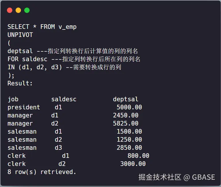 在GBase 8s中,Unpivot操作的语法同样简单明了。通过指定目标字段和源字段,我们可以将数据从列格式转换为行格式,从而实现数据的深入分析。