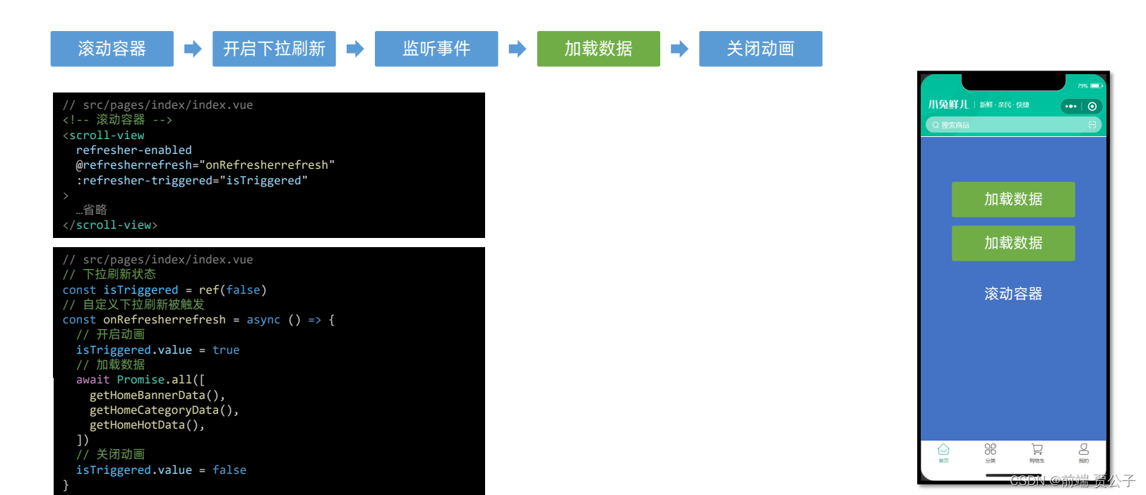 下拉刷新实际上是在用户操作下拉交互时 重新调用接口 ,然后将新获取的数据再次渲染到页面中。
