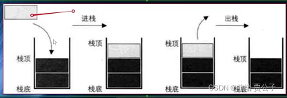 - 从一个栈删除元素右称作出栈或者退栈,他是把栈顶元素删除掉,使其相邻的元素成为新的栈顶元素