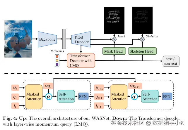该模型包含一个带有层级动量查询(Layer-wise Momentum Query, LMQ)的解码器,用于处理艺术文本变化多端的局部笔画形状;同时设计了一个骨架辅助头(Skeleton-assisted Head),指导模型关注全局结构。