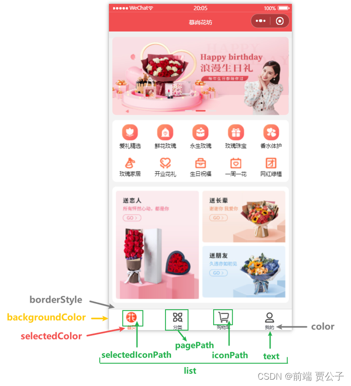 - list 是一个数组, 只能配置最少 2 个、最多 5 个 tab