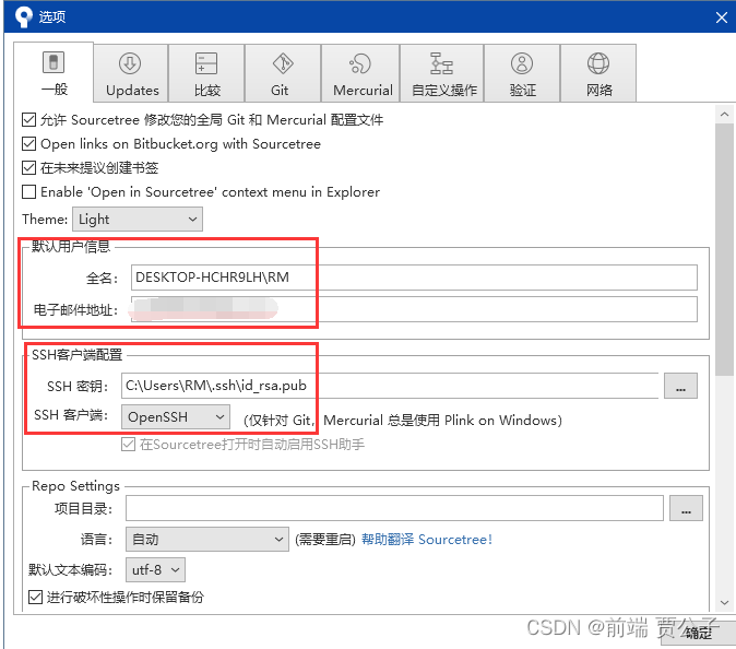 - 打开sourcetree,点击"工具-->选项-->一般",选择SSH密钥的位置为刚刚生成密钥的路径,SSH客户端选择OpenSSH,点击确定。