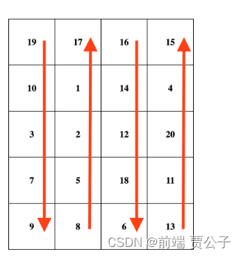 蜗牛排序从左上角的单元格开始,从当前数组的第一个值开始。然后,它从上到下遍历第一列,接着移动到右边的下一列,并从下到上遍历它。将这种模式持续下去,每列交替变换遍历方向,直到覆盖整个数组。例如,当给定输入数组 [19, 10, 3, 7, 9, 8, 5, 2, 1, 17, 16, 14, 12, 18, 6, 13, 11, 20, 4, 15] ,当 rowsCount = 5 且 colsCount = 4 时,需要输出矩阵如下图所示。注意,矩阵沿箭头方向对应于原数组中数字的顺序