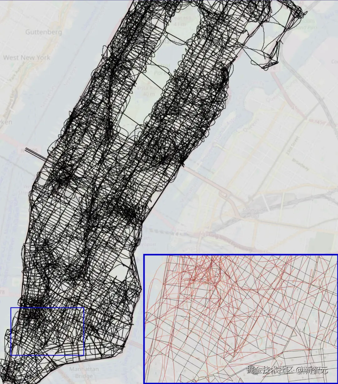 仔细检查发现,AI 竟然推演出各种离谱路线——比如横穿中央公园的直线,或者斜着连跨好几个街区。