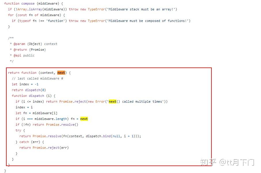 这不就实现了吗?刚刚我留了一个坑就是没放 koa-compose 的源码,下面是源码: