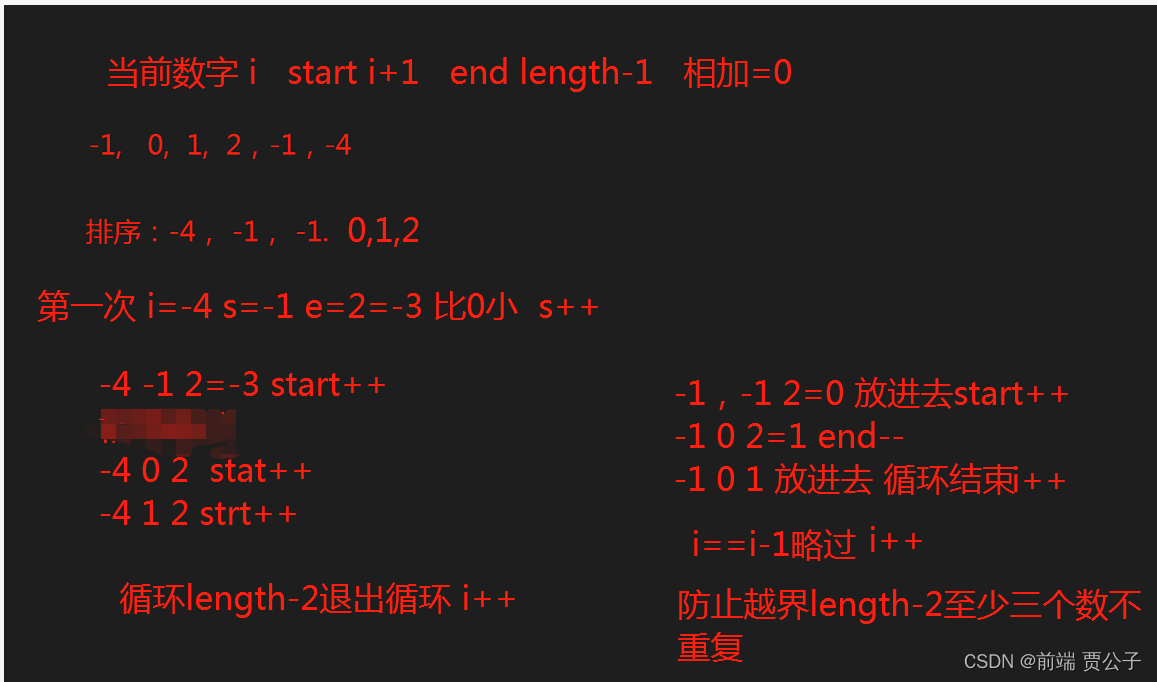 - 如果数字不同,则设置start=i+1,end=length-1,查看i start end 三个数的和比0大还是小,如果比0小start++,比0大end--,如果等于0把三个数加到结果里面