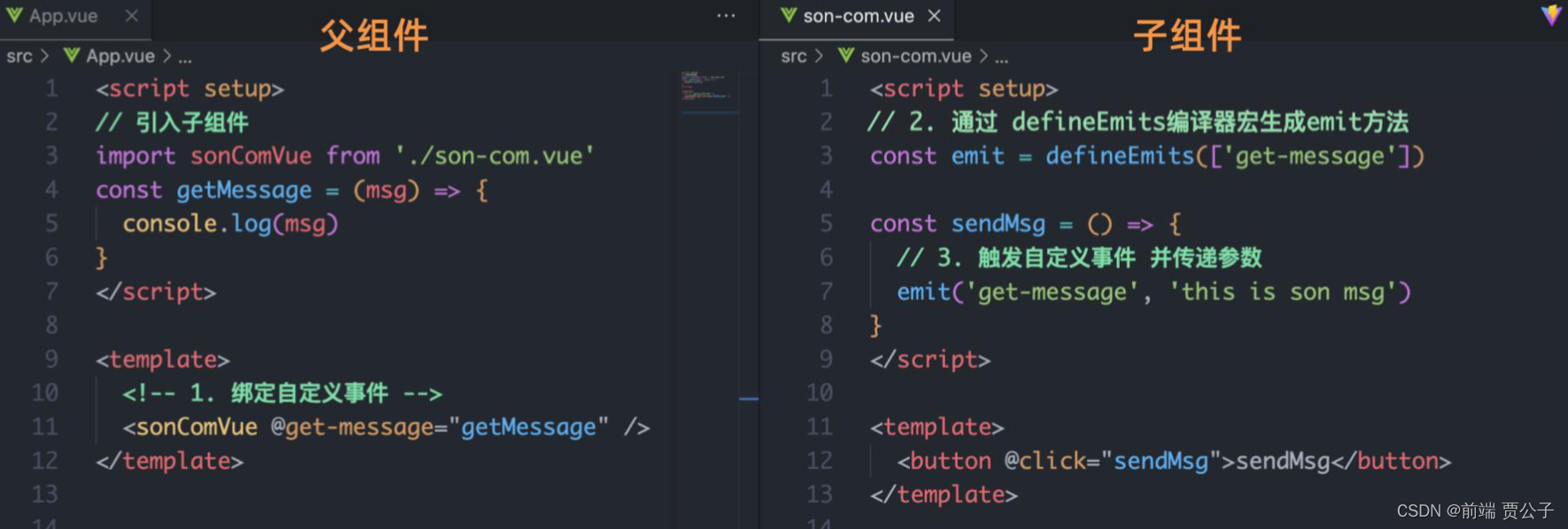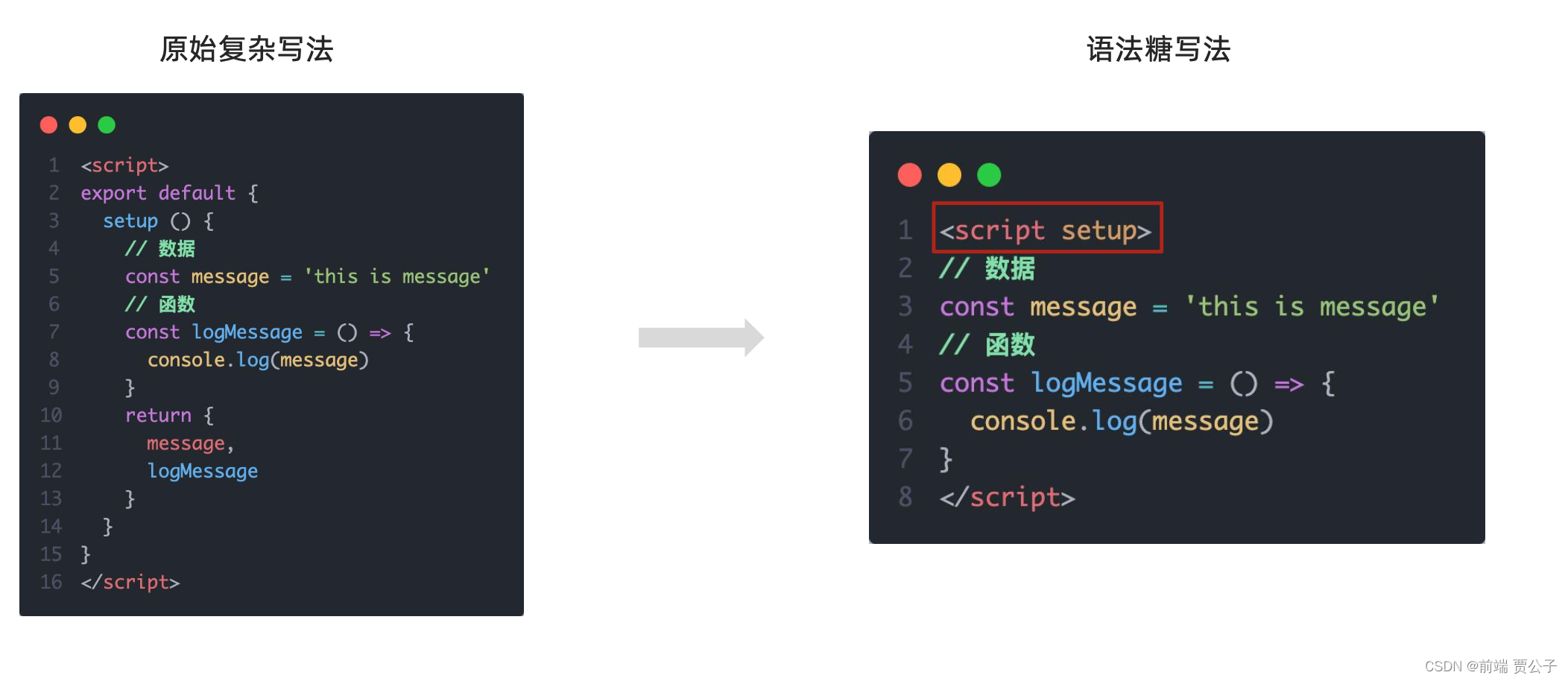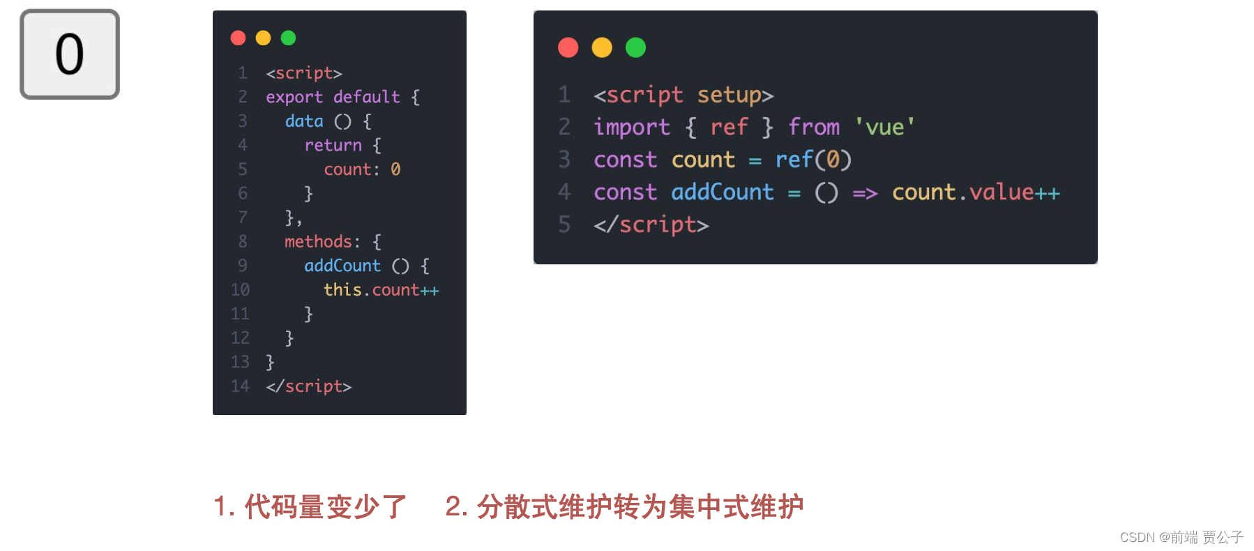 变化一:脚本script和模板template顺序调整 变化二:模板template不再要求唯一根元素 变化三:脚本script添加setup标识支持组合式API