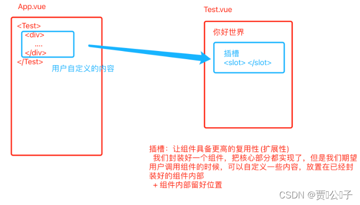 - 我们封装好一个组件,把核心部分都实现了,但是我们期望用户调用组件的时候,可以自定义一些内容,防止在已经封装好的组件内部:
