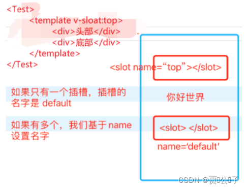 <Test><Test>内自己写的代码,我们用template包裹代码,并把v-slot:xxx写在template上,这时就会将xxx里面的代码,包裹到组件源代码的<slot name=”xxx“></slot>的标签中 - ==组件内部:==