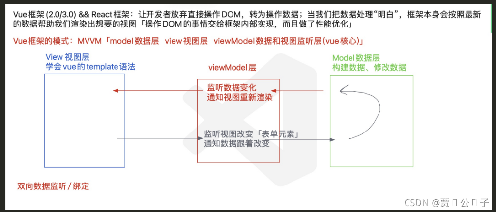 Vue是基于MVVM模式构建的框架,它本身实现了viewModel层去监听数据/视图的变化,从而去渲染视图/修改数据,所以我们学习vue主要考虑两条主线