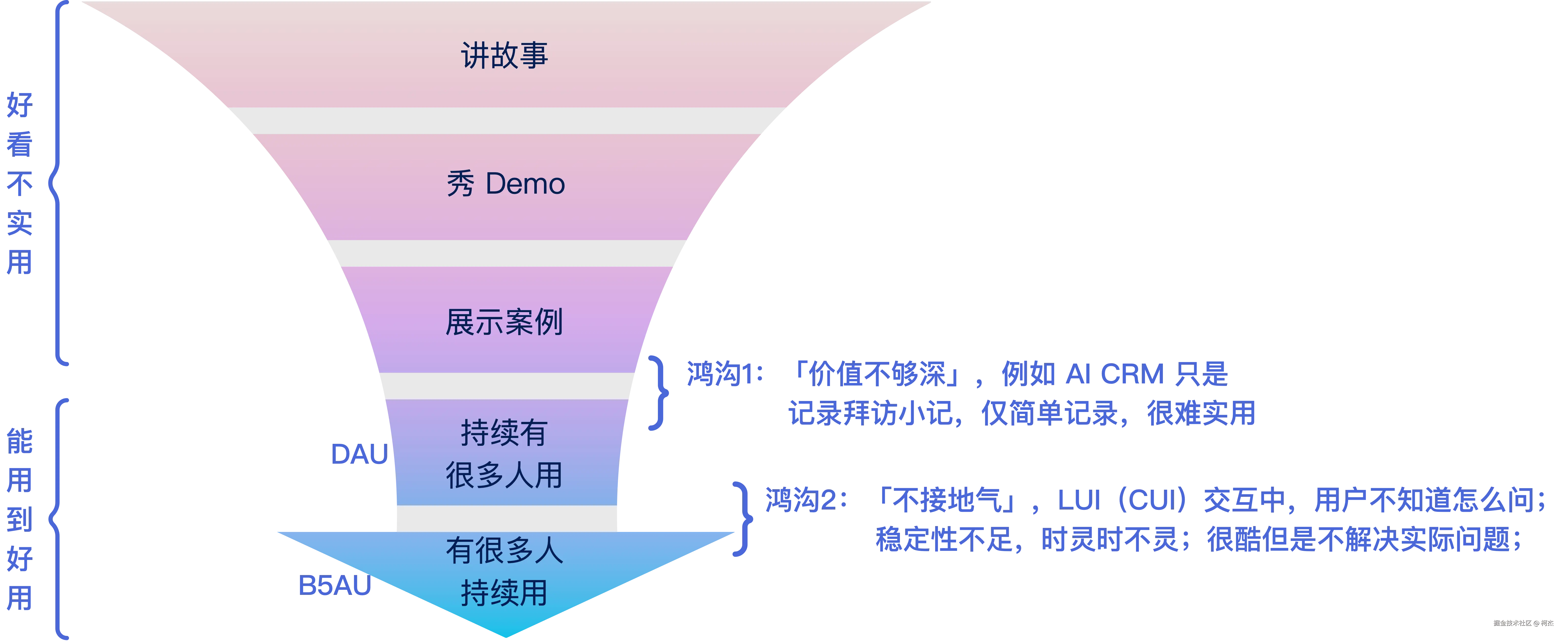 这里总结一下 AI 应用走向成功之路的「流失漏斗」和「两大鸿沟」: