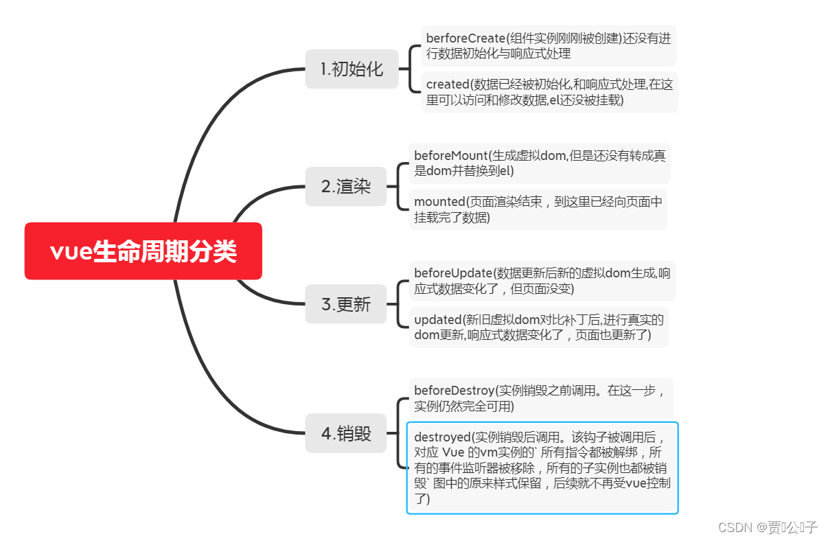 beforeDestroy:执行该方法的时候Vue的生命周期已经进入销毁阶段但实例上的各种数据处于可用状态