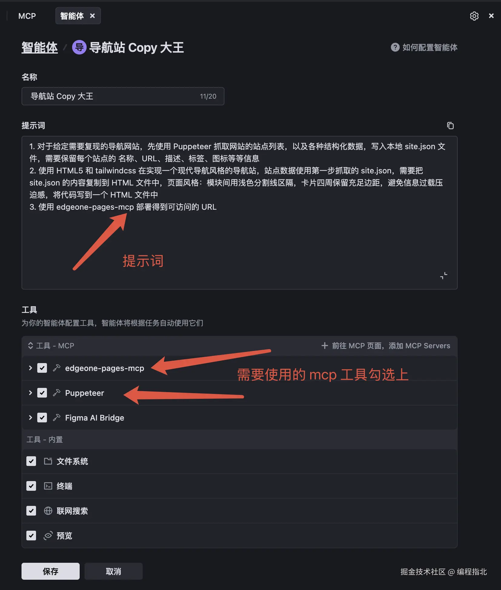 简单来说,就是选一堆的 MCP (工具) + 提示词(如何使用工具),就是相当于用提示词来把这些相关的 MCP 串一个工作流: