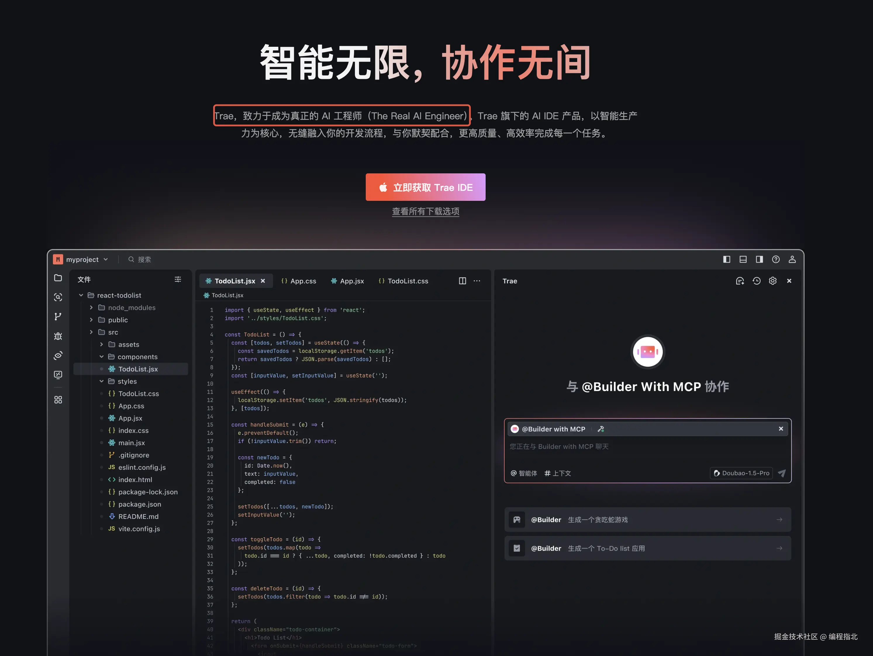 而国内科技巨头字节也在这个领域强势布局,率先推出了国产的 AI 原生 IDE ——Trae。