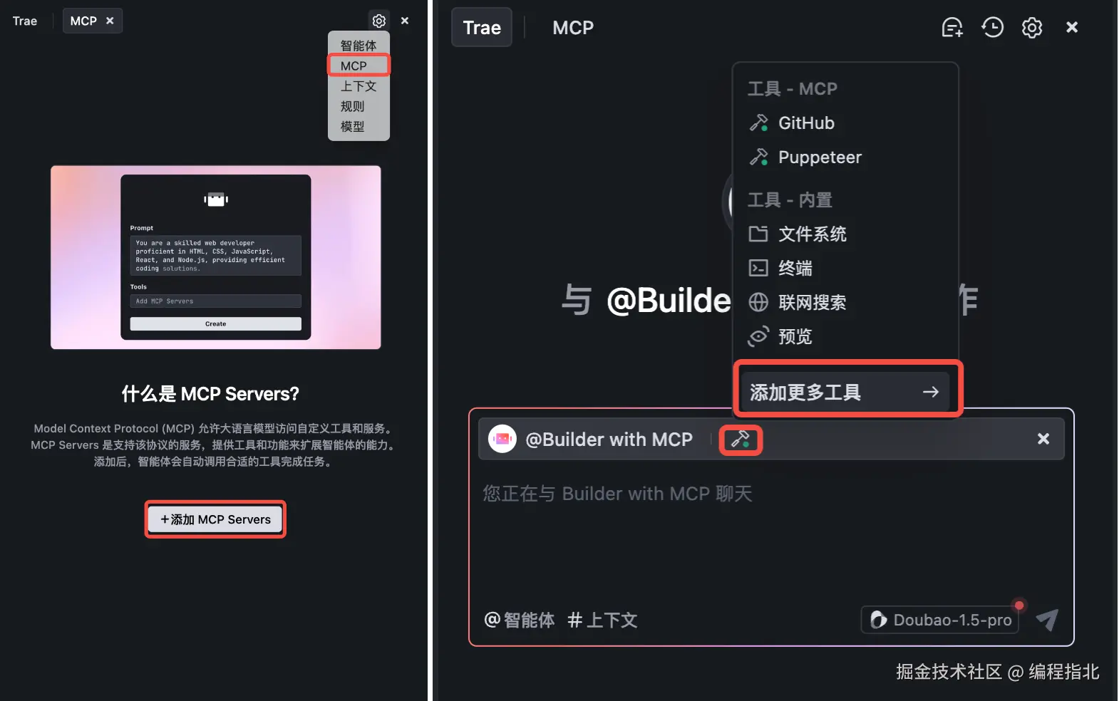 在 Trae 里,可以在右上角设计里面找到 MCP 入口,或者是对话框【添加更多工具】: