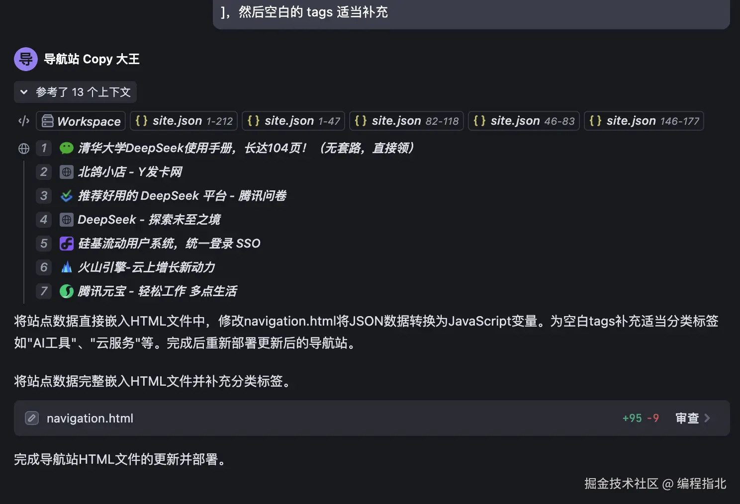 不过 puppeteer 在抓取数据的时候,tags 标签部分似乎没抓到,不过也是小问题,我让它 AI 自己抓取 Web 上的信息,补充这些站点的特点作为 tag: