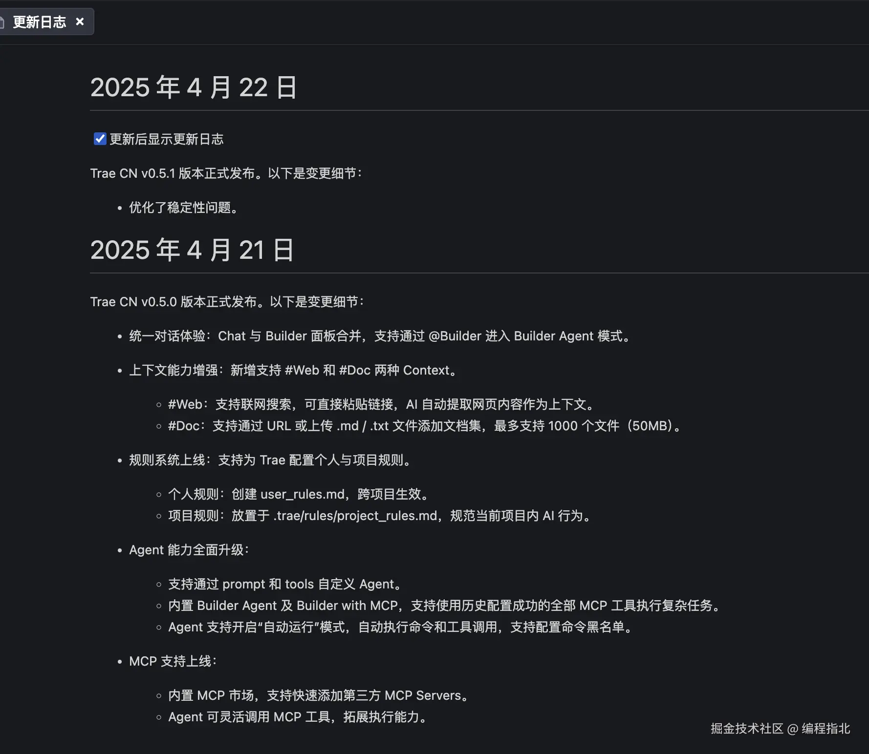 在前两天打开 Trae 的时候,发现连续两天都发布了更新: