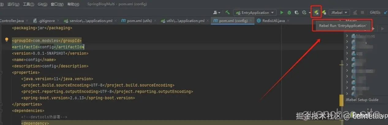 将项目重新启动,启动的时候使用Rebel Run ‘EntryApplication’来启动,如下图所示:
