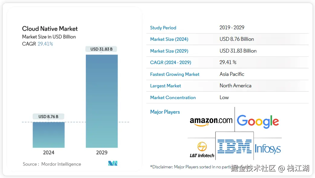 根据Mordor Intelligence报告,2024年全球云原生市场规模达87.6亿美元,预计2029年将以29.4%的复合增长率增至318.3亿美元,亚太地区成为增长最快市场。