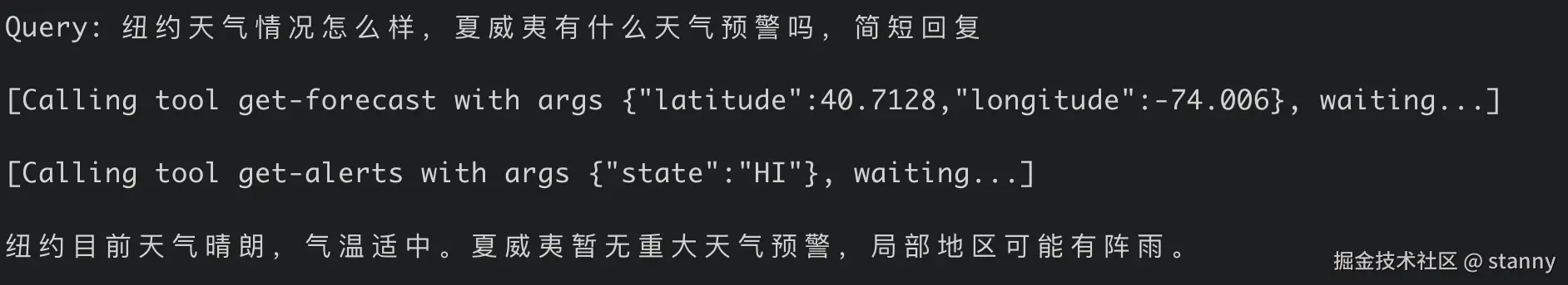 case 1:夏威夷的天气情况查询,包含 1 次工具调用