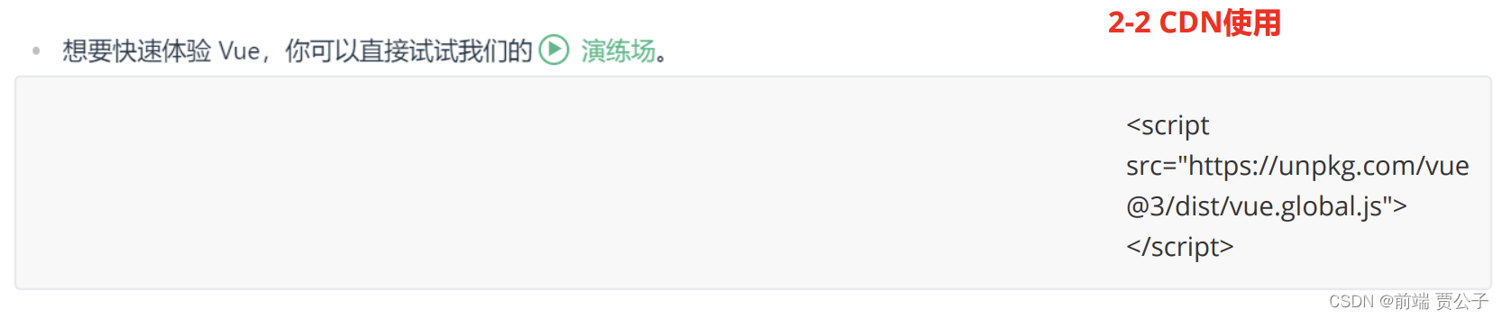 通过 CDN 使用 Vue 时,不涉及“构建步骤”。这使得设置更加简单,并且可以用于增强静态的 HTML 或与后端框架集成。但是,你将无法使用单文件组件 (SFC) 语法。