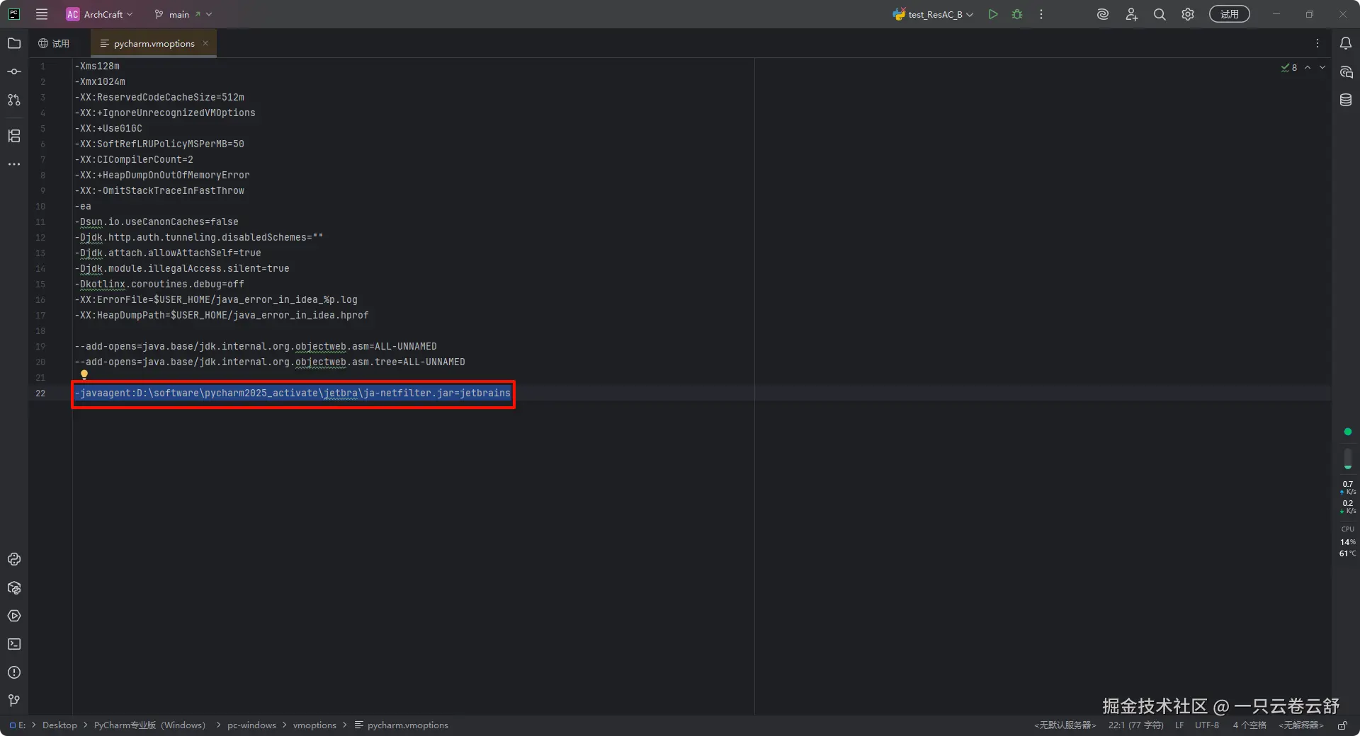 常见的 install-*.vbs 脚本尝试自动将 -javaagent 参数及其指向 ja-netfilter.jar 的路径写入 PyCharm 的 .vmoptions 配置文件中。然而,在以下几种情况下,自动配置可能会失败: