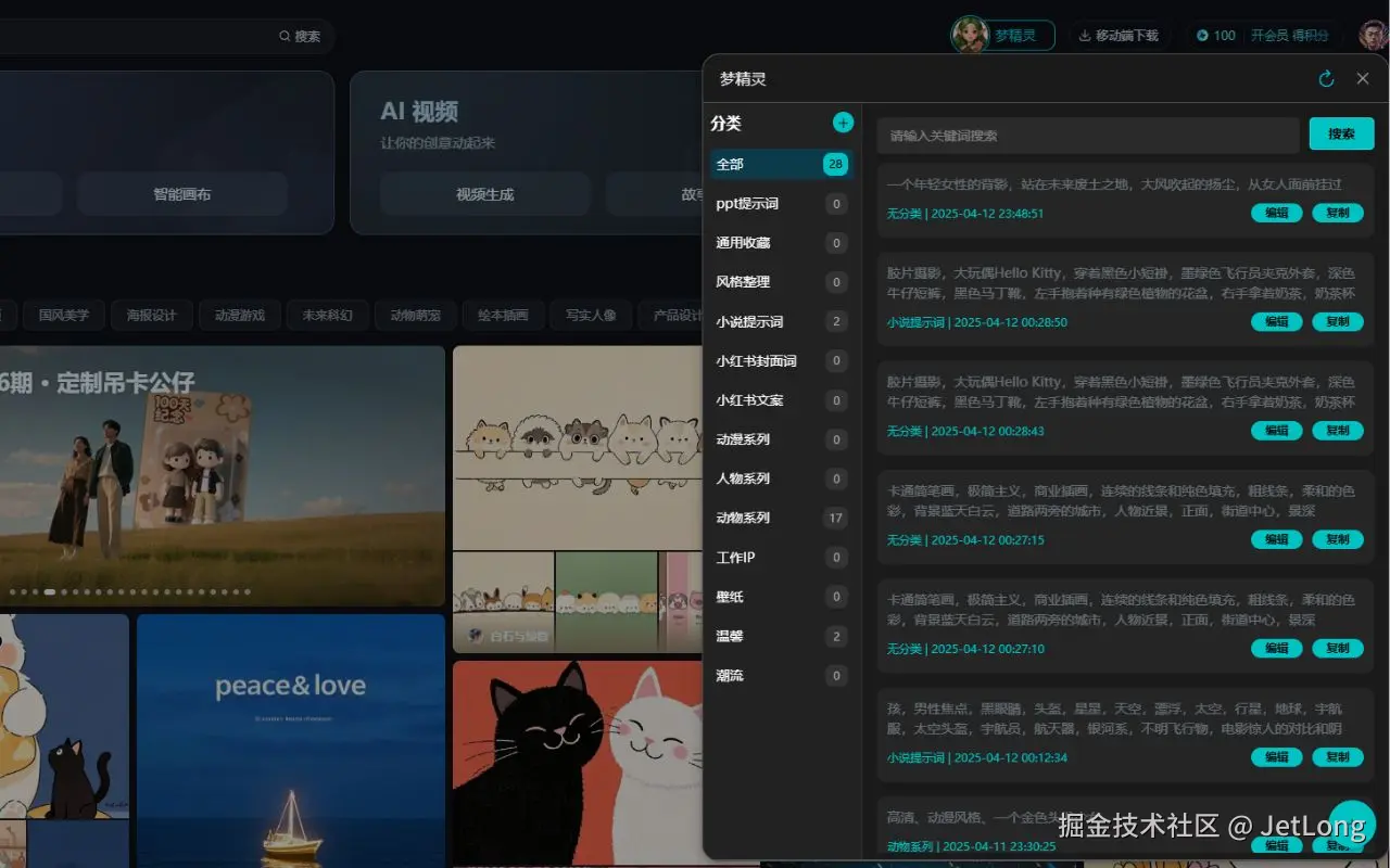 为了管理我那混乱的提示词,我开发了梦精灵提示词管理器。作为一名程序员,我每天都要和多个 AI 绘画平台打交道,从即梦到通义万象,从豆包到 DeepSeek,不同风格、不同需求的提示词在各个平台间来回切换,乱成一团麻。找一个用过的优质提示词,得在各个平台翻好久,不仅浪费时间,还严重影响创作效率。