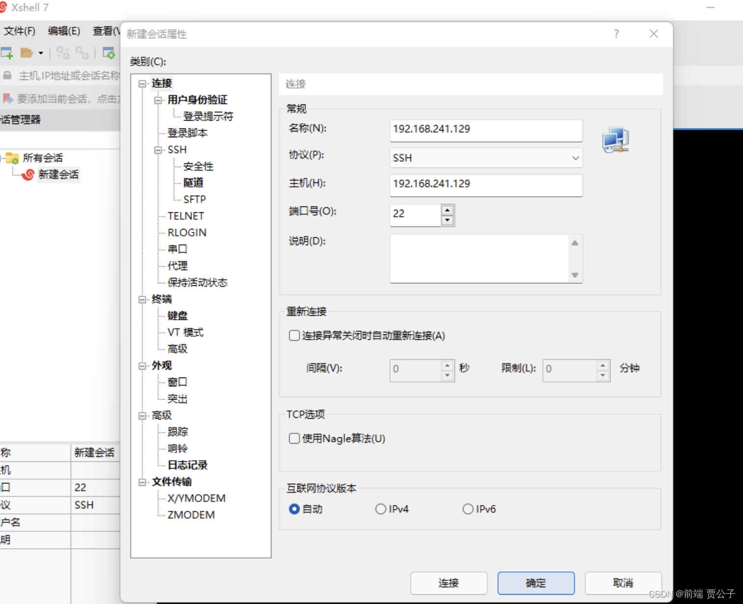 - 3.名称填写你刚刚查询到的 虚拟机 的IP地址,主机Xshell会自动帮你补齐