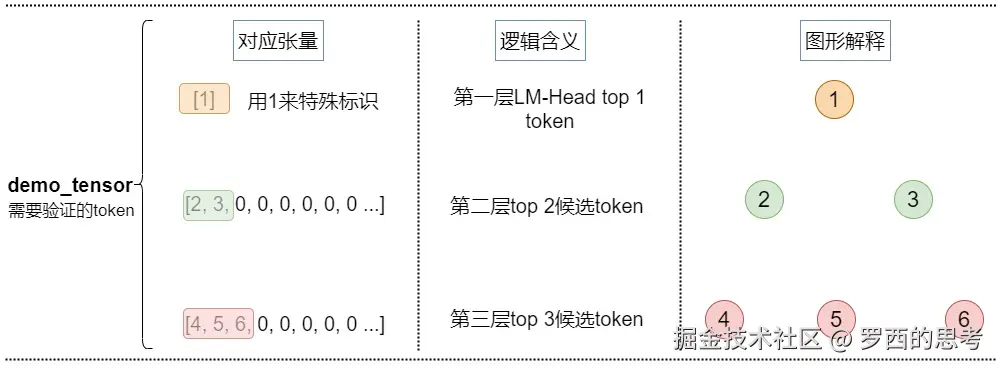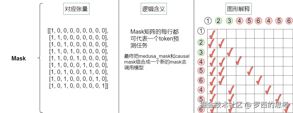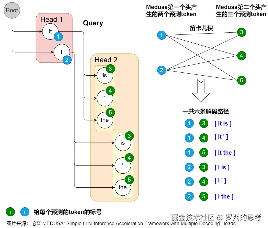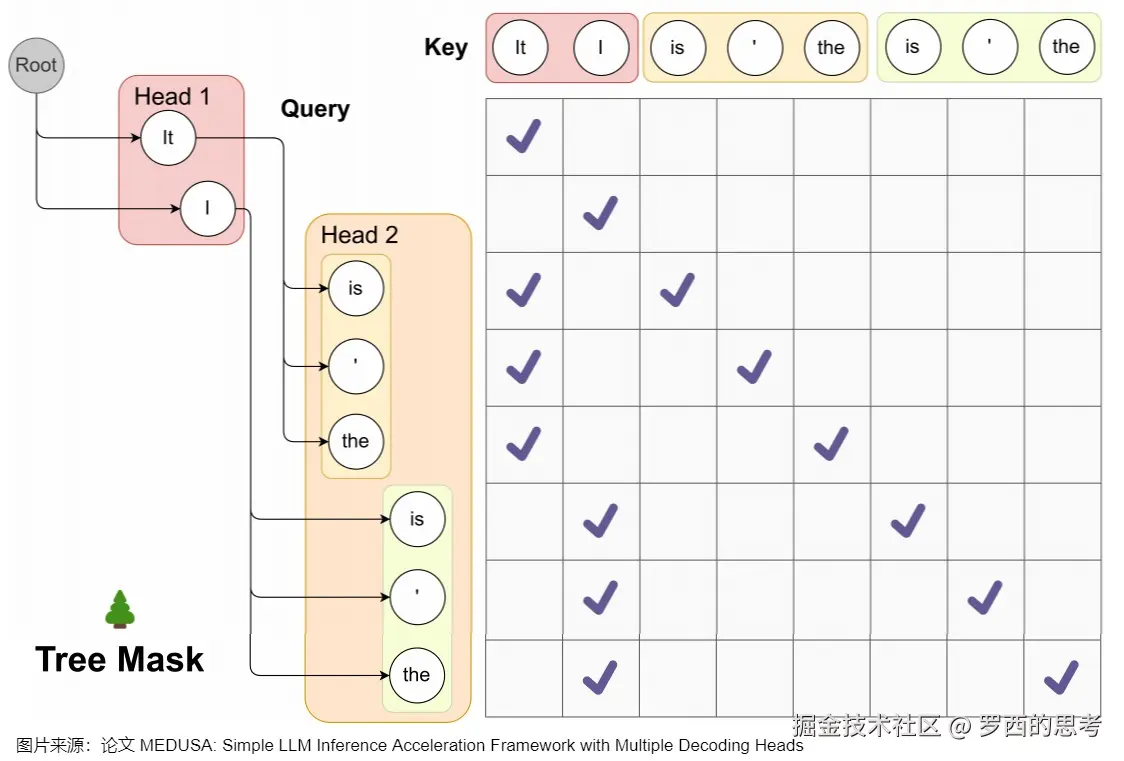 Medusa 中的树和注意力掩码矩阵如下图所示。在每一跳中,我们看到图中Medusa保留了多个可能的token,也就是概率最高的几个token。这样构成了所谓的树结构,直观来说,就是每1跳的每1个token都可能和下1跳的所有token组合成句子,也可以就在这1跳终止。例如,在图中,一共2个head生成了2跳的token,那么这棵树包含了6种可能的句子:Head 1 在下一个位置生成 2 个可能的 Token(It 和 I),Head 2 在下下一个位置生成 3 个可能的 Token(is,’ 和 the),这样下一个位置和下下一个位置就有了 2 x 3 = 6 种可能的候选序列,如下图左侧所示。