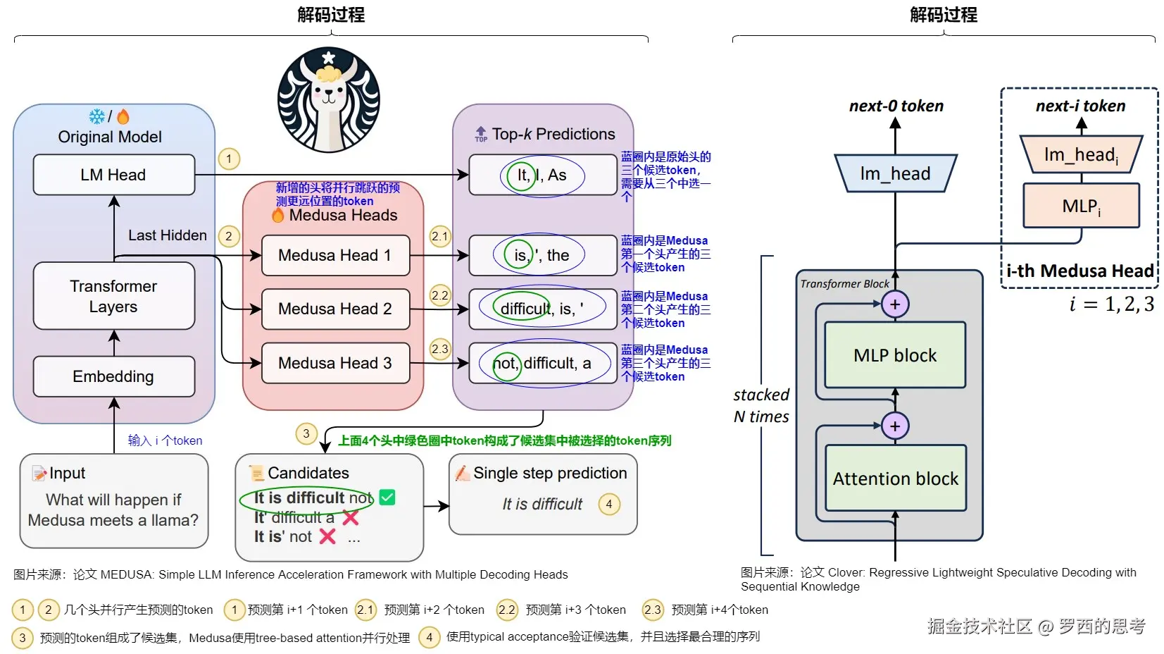 | 多头 | 加入k个project layer,这k个project layer的输出就是k个不同位置token的logits | 在 LLM 的最后一个 Transformer Layer 之后保留原始的 LM Head,然后额外增加多个 Medusa Head,获得多个候选的 Token 序列 | |