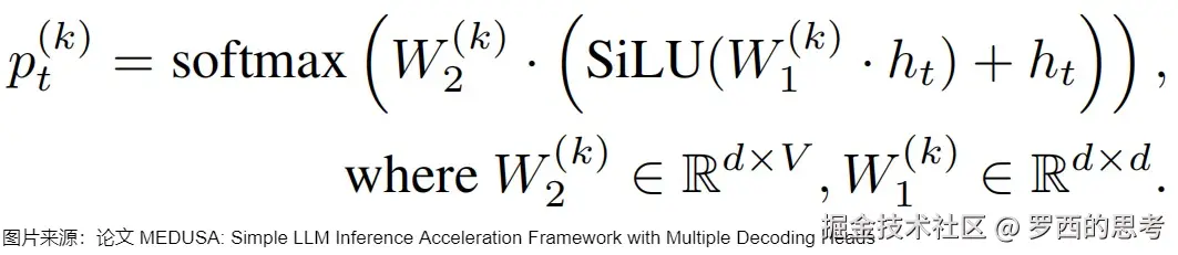 为了抛弃独立的 Draft Model,只保留一个模型,同时保留 Draft-then-Verify 范式,Medusa 在主干模型的最终隐藏层之后添加了若干个 Medusa Heads,每个解码头是一个带残差连接的单层前馈网络。这些Medusa Heads是对BPD中多 Head 的升级,即由原来的一个 Head 生成一个 Token 变成一个 head 生成多个候选 Token。因为这些 Heads 具有预测对应位置 token 的能力,并且可以并行地执行,因此可以实现在一次前向中得到多个 draft tokens。具体如下图所示。