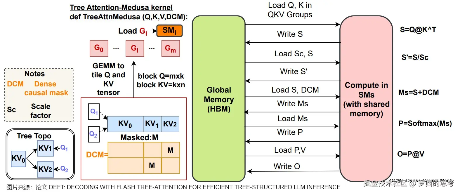另外,下图给出了Medusa 的操作流程。当没有算子融合或者Tiling策略时,,DCM(Dense Causal Mask),Softmax都会导致显存和片上缓存之间大量的IO操作。