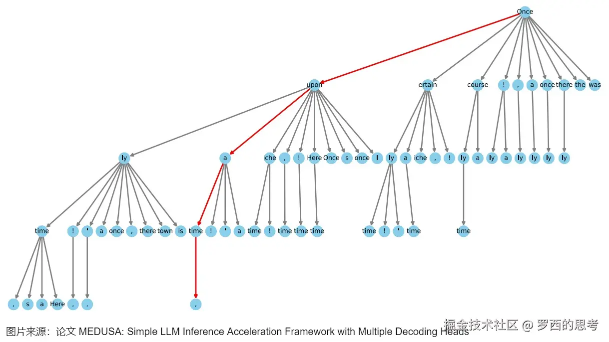 - 生成候选者。MEDUSA通过接在原模型的多个Medusa解码头来获取多个位置的候选token