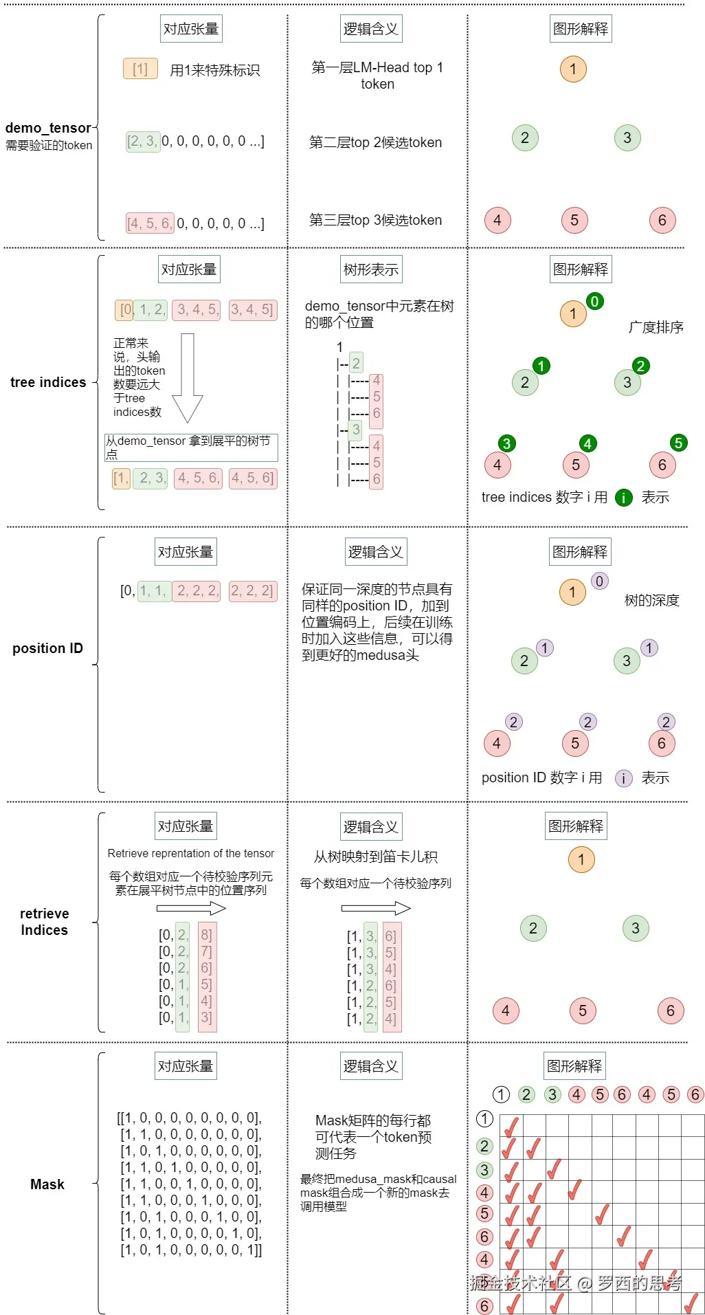 | Tree | 将SSMs预测的多个候选merge为一个新的token tree,采用原始LLM做并行验证。SpecInfer中每个speculator生成称的序列长度不同,所以Mask是动态变化的。 | Medusa的Tree Attention Mask在Infrence过程中是静态不变的,这使得对树注意力Mask的预处理进一步提高了效率。 | |