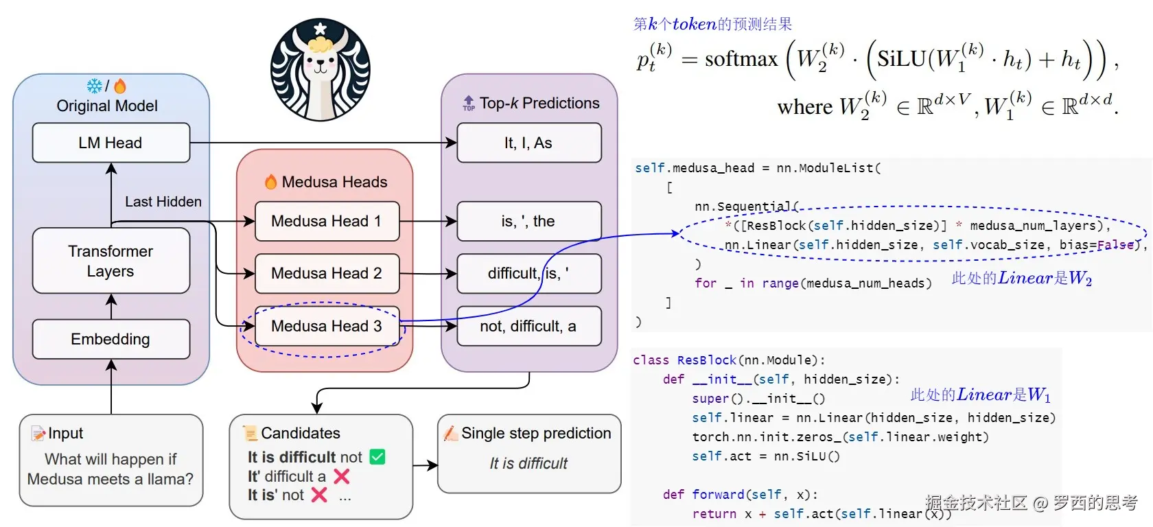 下面代码给出了美杜莎的模型结构。Medusa 是在 LLM 的最后一个 Transformer Layer 之后保留原始的 LM Head,然后额外加多个 Medusa Head,也就是多个不同分支输出。这样可以预测出多个候选的 Token 序列。 Medusa head的输入是大模型的隐藏层输出。这是和使用外挂小模型投机解码的另一个重要不同。外挂小模型的输入是查表得到的token embedding,比这里的大模型最后一层隐藏层要弱的多,因此比较依赖小模型的性能。正是因为借助大模型的隐藏层输出,这里的Medusa head的结构都十分简单。