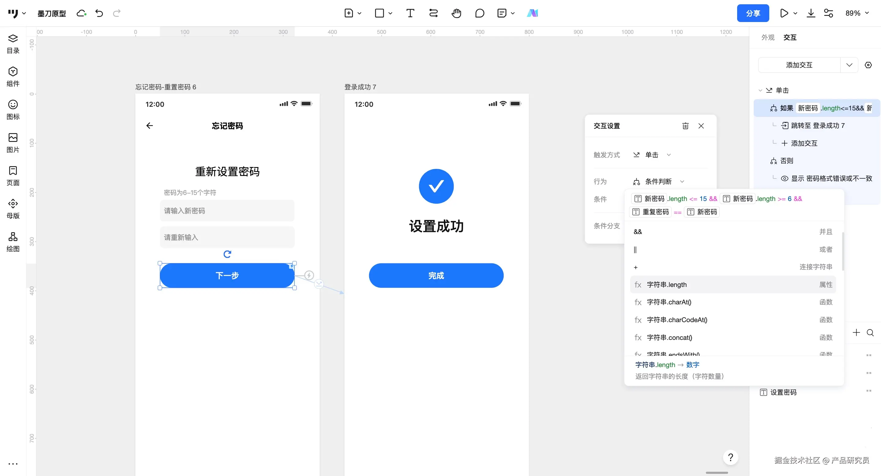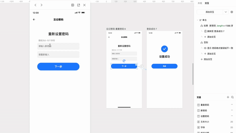 举例一个变量、条件判断与函数运算功能在APP原型设计中的应用——APP重置密码(基于墨刀原型操作),帮助你更好的了解高级交互功能的效果。