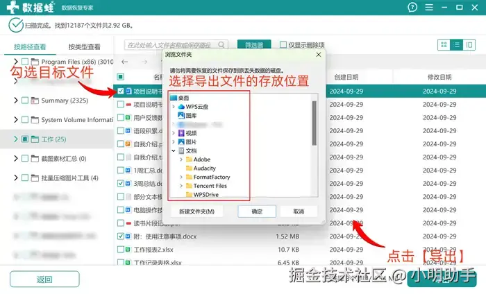 第2步: 耐心等待后,在指定的位置上选择需要恢复的文件,点击【导出】后再在弹窗中选择导出文件合适的存放位置。