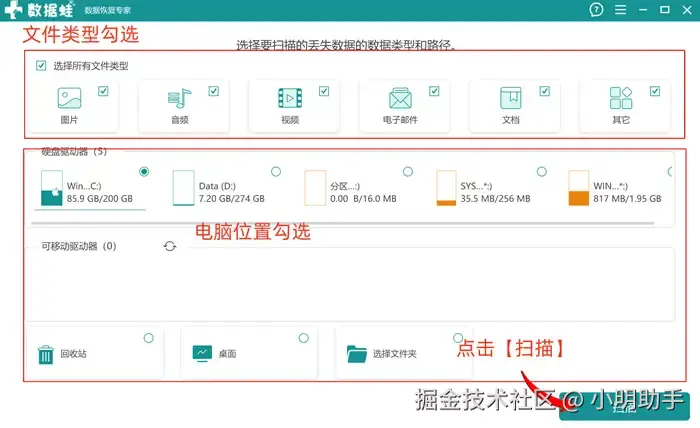 第1步: 在软件的首页根据提示选择将要进行扫描的文件类型和电脑位置,点击【扫描】;