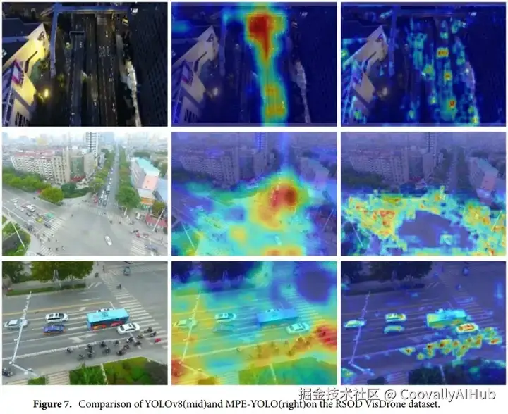 通过精心挑选图像样本,将基线模型和 MPE-YOLO 模型应用于目标检测。如图所示,在多种场景和挑战性条件下,MPE-YOLO 模型的检测置信度显著优于基线模型。这体现在其识别的目标边界框具有更高的置信度得分,并且这些得分与实际目标更加一致。更重要的是,MPE-YOLO 在降低误报和漏报方面也表现出显著的提升,能够准确识别和识别大多数目标,同时最大限度地减少非目标区域的误识别。此外,即使在阴影或光照条件不佳的情况下,MPE-YOLO 也能实现较低的漏检率。