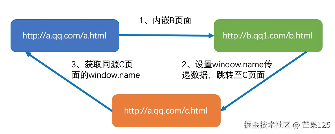 <!-- B页面 http://b.qq1.com/b.html --><script> window.name = "这里是B页面!"; window.location = "http://a.qq.com/c.html";</script>