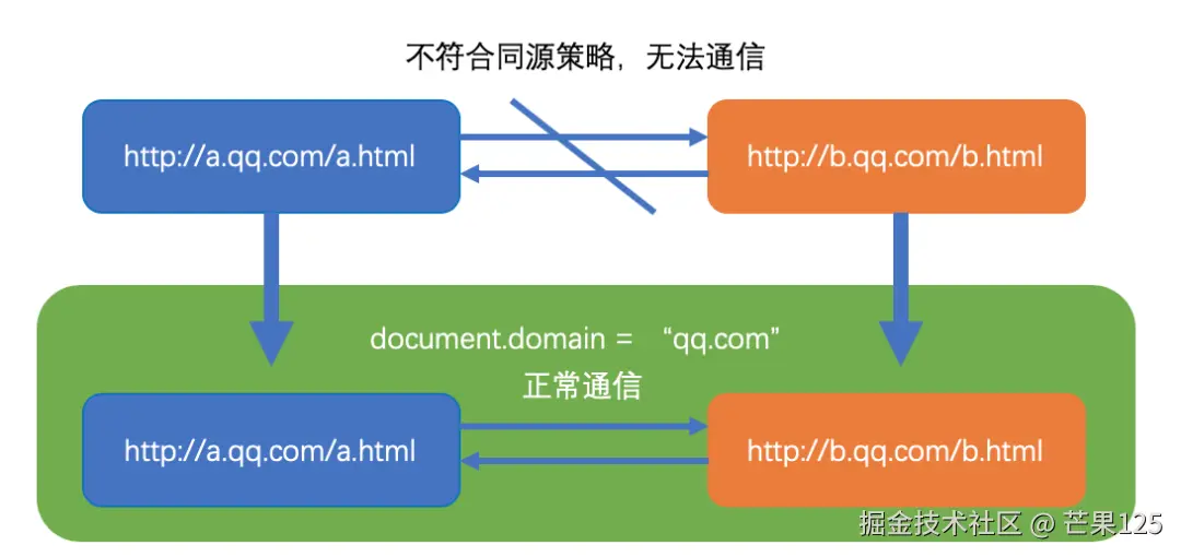 此方案仅适用于主域相同,子域不同的前端通信跨域场景。如下图所示,两个不符合同源策略的页面a.qq.com/a.html和http…