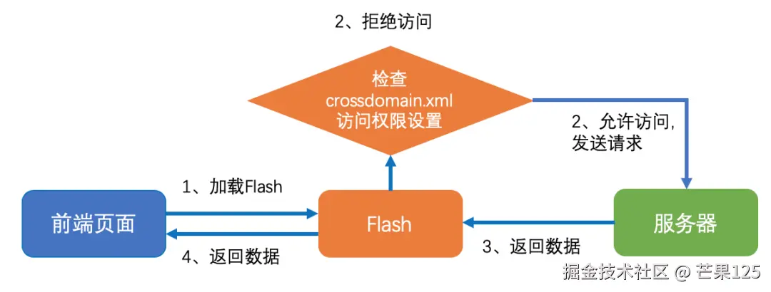Flash在进行跨域请求时,默认首先会发送预检请求,检查服务器域名根目录下的crossdomain.xml文件,判断请求域是否合法。如果域名不合法,Flash直接封杀请求;如果域名合法,则发送真实请求,获取数据并返回给前端页面。