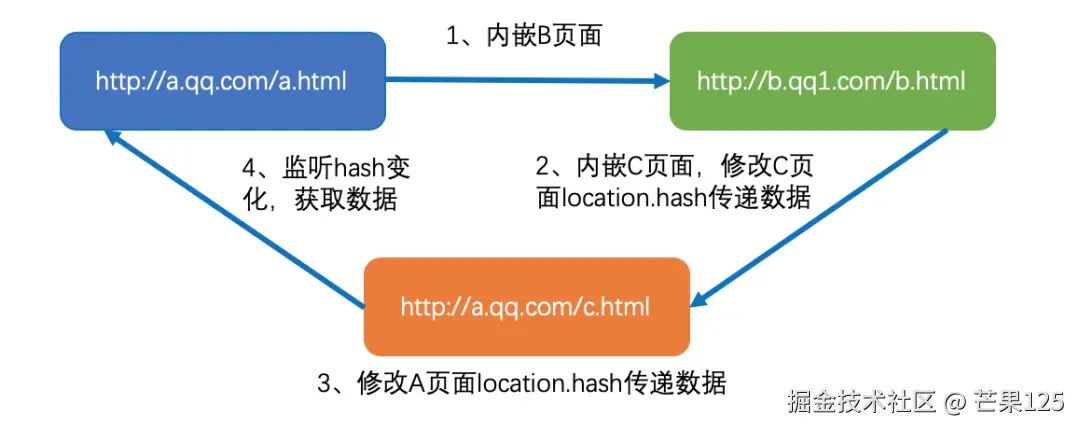 <!-- B页面 http://b.qq1.com/b.html --><iframe id="iframe" src="http://a.qq.com/c.html"></iframe><script> // 向c.html传递hash值 var iframe = document.getElementById('iframe'); setTimeout(function() { iframe.src = iframe.src + '#user=saramliu'; }, 1000);</script>
