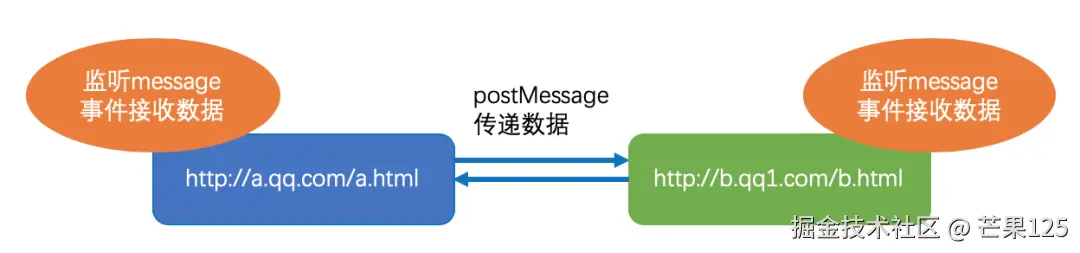 <!-- A页面 http://a.qq.com/a.html --><iframe id="iframe" src="http://b.qq1.com/b.html"></iframe><script> var iframe = document.getElementById('iframe'); iframe.onload = function() { var data = {meesage: "这里是A页面发的消息"}; var url = "http://b.qq1.com/b.html"; // 向B页面发送消息 iframe.contentWindow.postMessage(JSON.stringify(data), url); }; window.addEventListener("message", function(e) { alert("B页面发来消息:" + JSON.parse(e.data)); });</script>