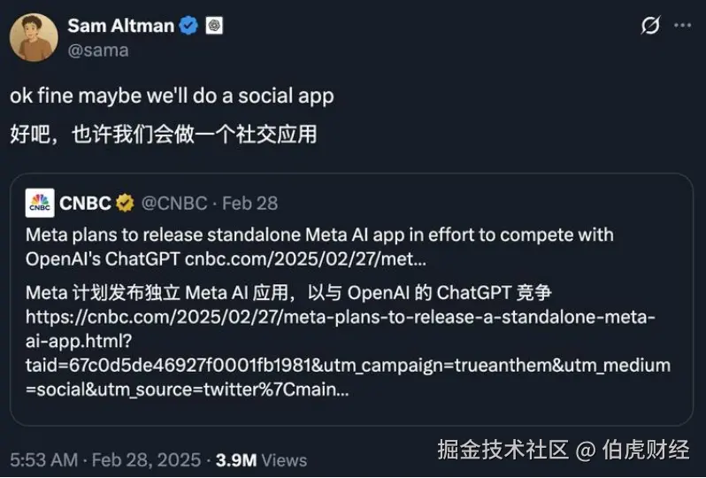 OpenAI虽未正式入局,但Sam Altman多次暗示“AI社交化”是必然趋势,他也在社交平台上提到,自己正在开发AI社交网络。