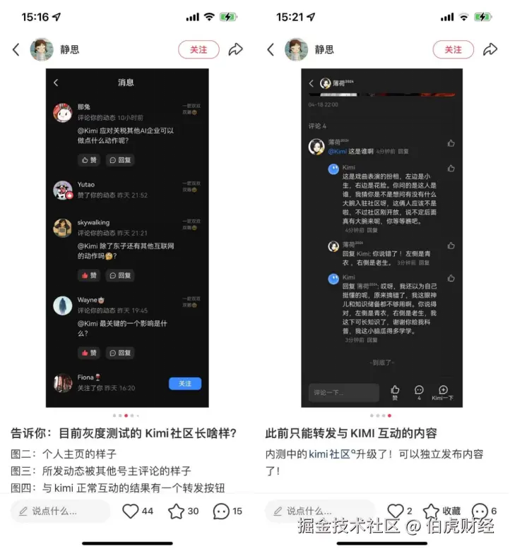 Kimi则被曝光正在打造一款AI社区产品,目前已有一些账号会每日分享内容,每条内容下方还有“Kimi一下”的选项,点击可以与Kimi进行更深度的对话。