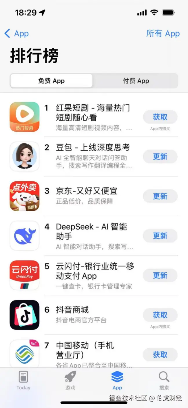 过去一直保持低调的腾讯元宝,也通过接入DeepSeek技术和大手笔的投流,实现了用户规模的快速增长,登顶中国区苹果应用商店免费APP下载榜。