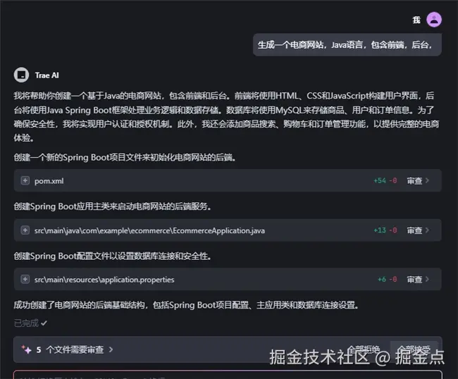 在面对复杂的 Java 工程级代码生成时,Trae 的局限性也逐渐显现。对于涉及复杂业务逻辑、多层架构以及大量依赖管理的 Java 项目,如企业级的 Spring Cloud 分布式系统开发,Trae 难以像飞算 JavaAI 那样一键生成完整且可用的工程代码(见上图)。它生成的代码可能只是部分功能的片段,在项目结构的完整性、代码的规范性以及与 Java 开发最佳实践的契合度上,与飞算 JavaAI 相比存在一定差距。在生成 Spring Cloud 项目代码时,飞算 JavaAI 能准确构建包含服务注册与发现、配置中心、负载均衡等完整功能模块的工程,而 Trae 可能仅能生成一些简单的服务接口代码片段,对于复杂的分布式配置和服务间调用逻辑的实现则显得力不从心。